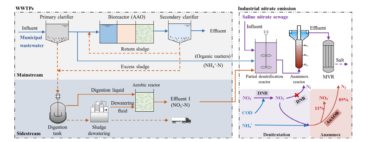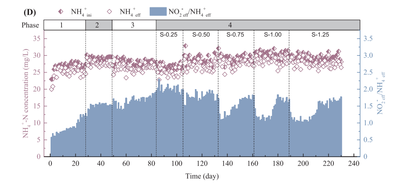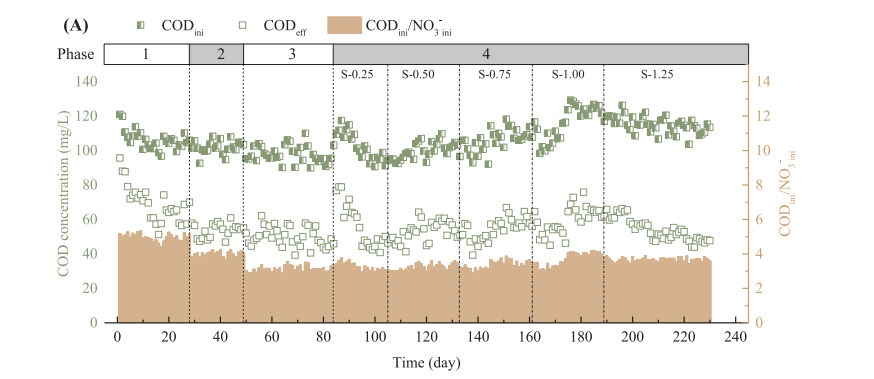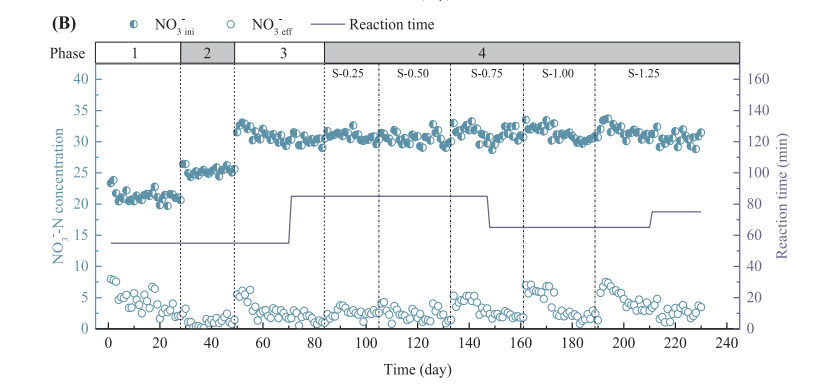 采用序批式反应器同时处理含盐硝酸盐污水和城市污水,研究了无机盐对部分反硝化(PD)的影响。在盐度为1.25 wt%、碳氮比为3.7的条件下,经230 d的实验进程,可获得80%的硝酸盐-亚硝酸盐转化率(NTR)。微生物群落分析结果表明,在PD系统中,Thauera仍占主导地位,但相对丰度由53.02% (0.0 wt%)下降到42.36% (1.25 wt%)。此外,当废水中亚硝酸盐/氨氮达到适宜的比例(约1.6)时,将PD与厌氧氨氧化相结合,将是一种很有前景的处理含盐硝酸盐污水的方法。