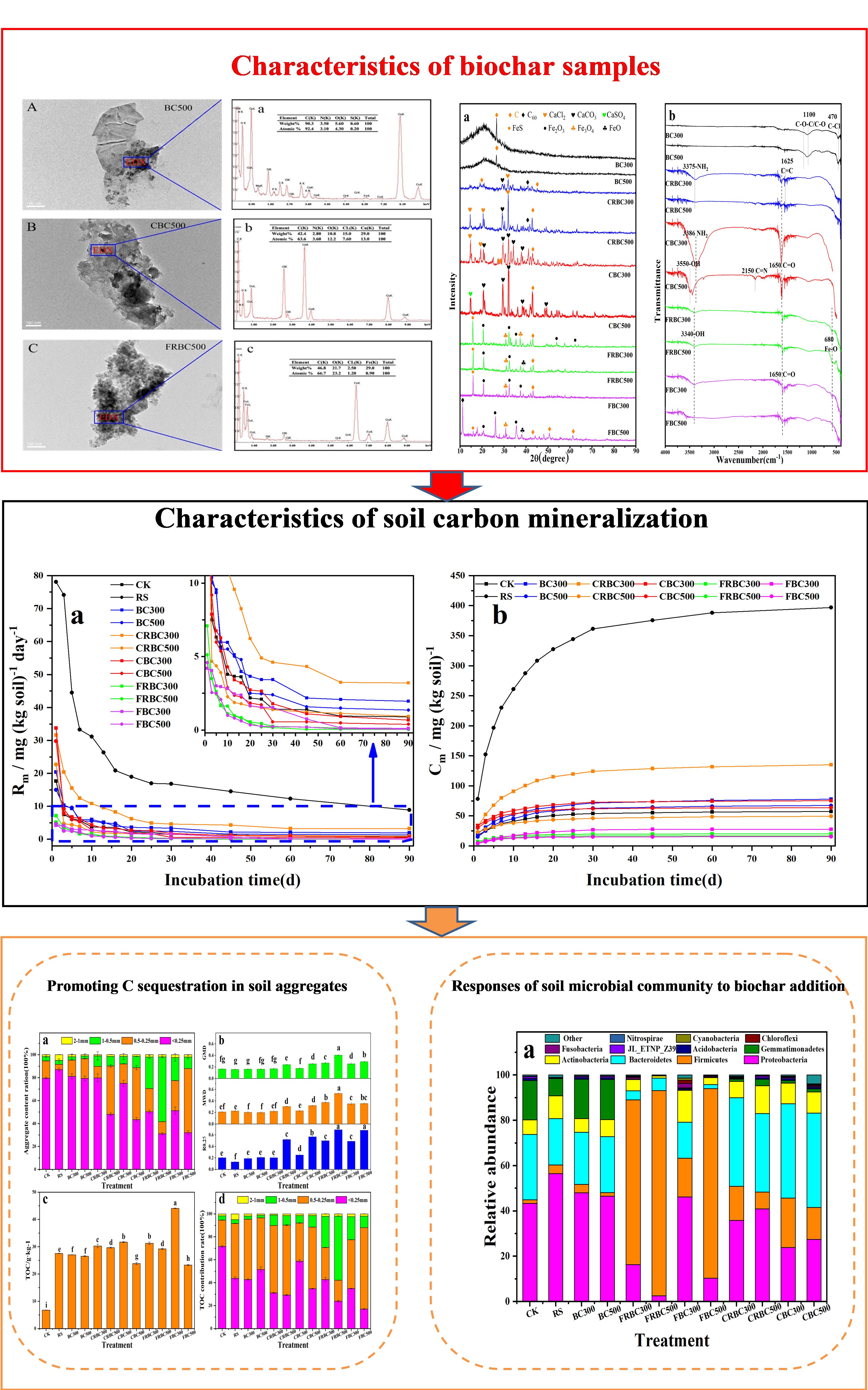 生物炭(Biochar)作为一种高效的提高土壤固碳能力的技术受到广泛关注。本研究通过芦苇秸秆原料前处理和芦苇秸秆生物炭后处理,在不同热解温度下制备一系列Fe或Ca离子改性的生物炭(MBC)。利用元素分析、TEM+EDX、FT-IR等方法对生物炭样品表征显示:经过矿物离子改性后,MBC成功负载丰富的Fe或Ca矿物质,且其表面官能团数量显著提高。经过为期90天的土壤矿化培养实验发现:与芦苇秸秆和未改性生物炭相比,MBC处理显著降低土壤有机碳矿化量,显著提高土壤团聚体稳定性和土壤有机碳在大颗粒团聚体(1~0.25mm)中的分布。通过对培养土壤微生物指标的分析结果显示:MBC添加诱导了微生物从以偏好不稳定碳的菌种变形菌门(Proteobacteria)和拟杆菌门(Bacteroidetes)为主导的群落结构向以偏好顽固碳的厚壁菌门(Firmicutes)为主导的群落结构转变。MBC通过提高土壤团聚体的物理保护和改变土壤微生物碳周转行为是其提高土壤有机碳固存的关键机制。该研究为MBC在修复退化的滨海湿地土壤“碳汇”功能方面的应用提供重要理论支撑。