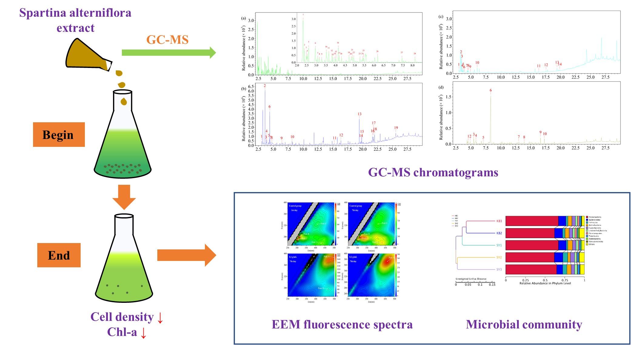 利用植物的化感作用对藻类的生长与增殖进行抑制是当前水华控制的新途径。植物产生的化感物质对藻类生长的抑制效率高,自身易降解因而基本不会引发新的生态环境污染,生态安全性较高,因此,该控制方法具有良好的发展前景。在本研究中,作者以互花米草为研究对象,利用互花米草提取物抑制铜绿微囊藻的生长,并对藻密度和EOM三维荧光光谱的变化特征进行了测量。结果表明,互花米草水提取物对铜绿微囊藻具有“低促高抑”的浓度效应。使用4种有机溶剂对互花米草提取物中的化感物质进行萃取分离,并通过GC-MS定性得到其抑制藻类生长的主要化感物质。这些化感物质可能通过破坏藻细胞的叶绿素a、削弱藻类的光合作用来发挥重要作用。此外,高通量测序的结果表明,互花米草提取物对水生系统中微生物群落的多样性和相对丰度影响很小,安全性较高。该研究为资源化利用互花米草和控制铜绿微囊藻水华提供了新思路。