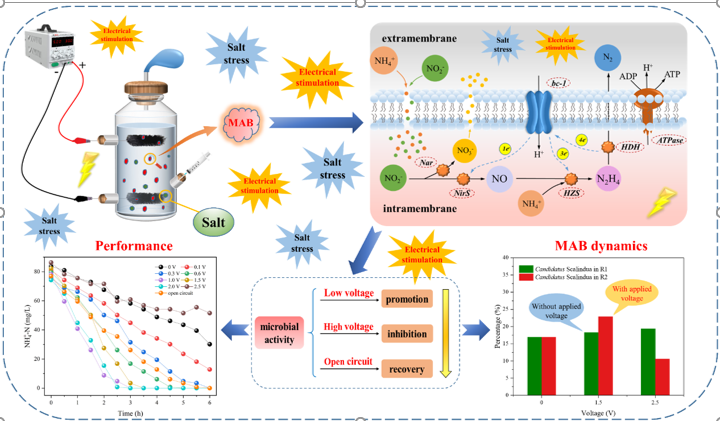 该研究主要围绕高盐废水生物处理过程中海洋厌氧氨氧化菌生长速率慢以及对运行环境变化敏感度高这一问题,利用微生物电化学技术对海洋厌氧氨氧化菌的脱氮性能和生物活性进行了强化,并对电场强化作用下的微生物群落结构和动态演替进行了深入解析。研究结果表明在电场作用下,海洋厌氧氨氧化菌的脱氮性能以及生物活性均得到了较大提升,此外,该菌种的丰度也显著提高,说明微生物电化学技术可以有效提升高盐废水处理效能。该研究工作得到了国家自然科学基金(51878362,52070105)、中国博后特助、中国博后面上一等资助以及中国石油集团等多项课题资助,研究成果丰富和拓展了微生物电化学技术在含盐污水生物脱氮方面的理论和应用,为高盐废水治理提供了创新思路和理论依据。