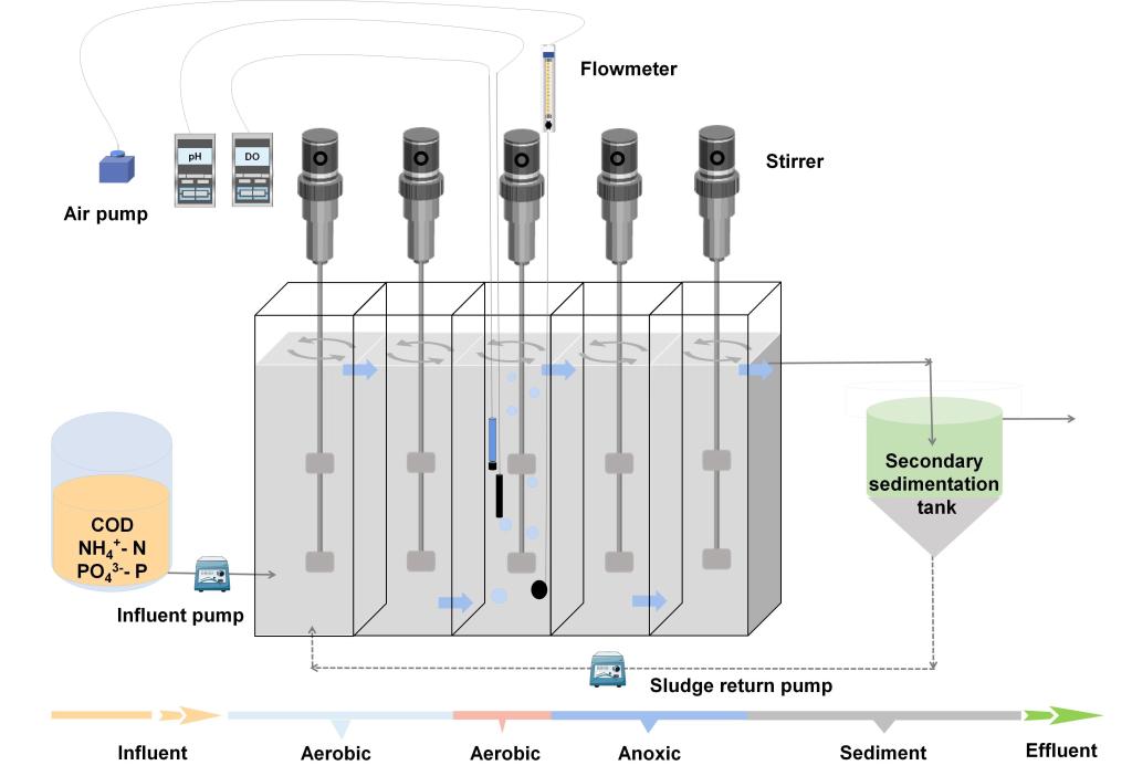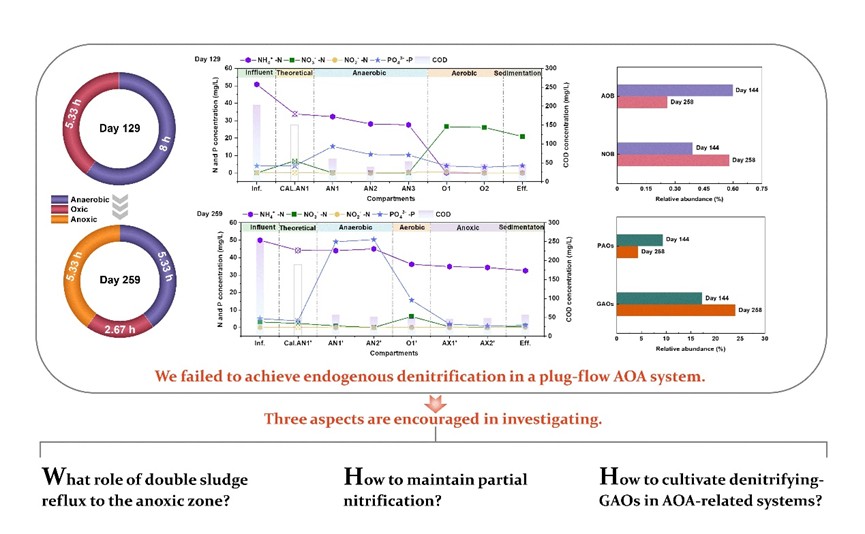 本研究采用连续流反应器,基于连续流AO工艺运行条件下启动AOA系统。实验室规模的连续流反应器(有效容积40 L)在AO模式下运行150天,97.87%的NH4+-N被氧化,44.4%的PO43--P被吸收。在AOA模式下,COD和PO43--P去除率稳定在80.06%和77.45%左右;缺氧隔室的NO3--N减少量较少(在5.33 h内仅减少6.3 mg/L),系统中富集的GAOs(Candidatus_Competibacter为14.27%,Defluviicoccus为3%)未能确保在连续流AOA系统中具有良好的ED性能,表明运行系统里内源性反硝化失败。系统内典型PAOs处于低丰度(<2%),但厌氧隔室内仍然存在明显的释磷现象;低溶解氧和长非曝气时间引起的AOB和NOB丰度降低导致硝化性能减弱。研究揭示了开发实际策略对启动优化AOA工艺的必要性,同时深入探讨了连续流AOA工艺相关研究前景,为国内污水处理厂的实际应用工程提供理论支持。