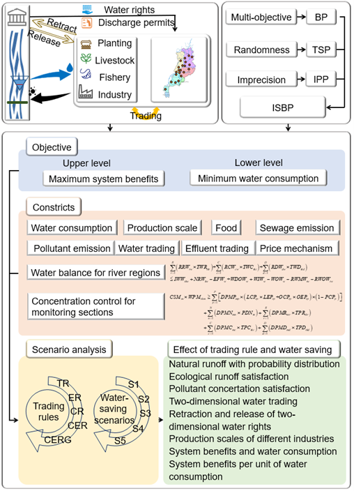 本研究在二维水权交易模型构建中充分考虑水资源、水生态和水环境(“三水”)关联以及政府参与机制,建立了基于“三水”-政府参与的二维水权交易模型群(TWG-2DWTMs),并将其应用于大沽河流域水资源管理实践研究中。结果表明:(1)模型通过减少生态流量匮乏河区及其上游用户水权持有量来减少河区用水量并提高生态流量满意度;(2)监测断面浓度控制机制通过减少超标监测断面上游用户排污权持有量以减少排污并保障水质;(3)政府参与机制可以实现二维水权在区县间的转移以及水权与排污权间的转换,提高水资源调控灵活性;(4)随着节水率的提高,用水量将减少,水生态和水环境将得到整体改善,此外,通过利用节约出的水资源,可以提高水资源利用率和系统效益。综上所述,该研究的开展,系统回答了在二维水权交易中要不要引入“三水”保障及政府参与机制及如何引入该机制的科学问题。