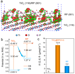 该研究针对红磷光催化剂电荷传输速率低导致光催化效率受限的关键问题,将红磷纳米层通过化学气相沉积策略负载于(116)高指数面暴露的氧化钛上,构建了具有直接Z型电荷传输机制的氧化钛/红磷异质结材料。氧化钛和红磷之间的强界面相互作用形成的内建电场驱动光生电荷的定向迁移,使得红磷的导带和氧化钛的价带分别保留了具有高氧化还原能力的光生电子和空穴,进而提升光催化分解水析氢效率,为设计高效光催化材料提供了新思路。