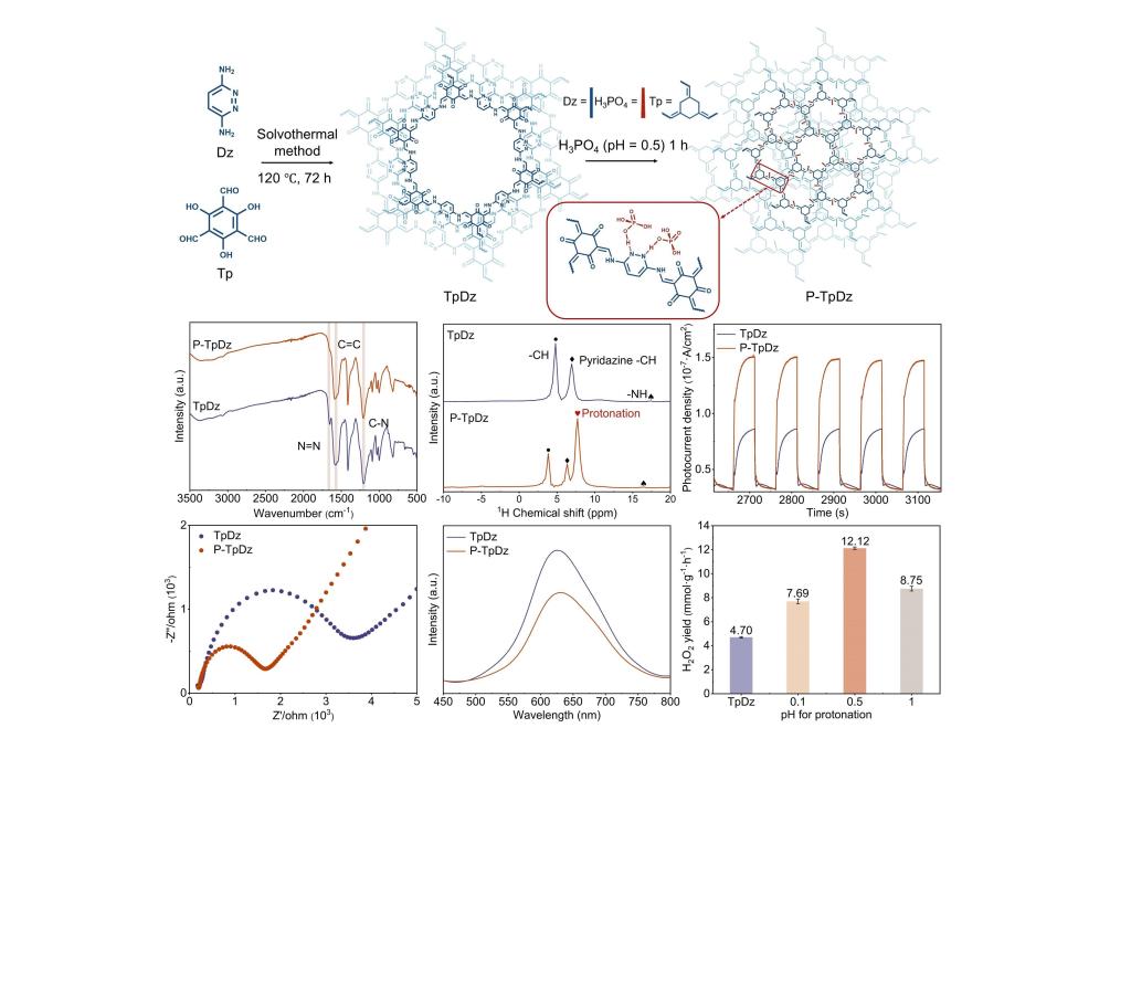 过氧化氢(H2O2)作为绿色氧化剂和化学燃料,广泛应用于化学合成、环境修复、燃料电池技术和医疗卫生科学等领域,然而,基于2e-氧化还原反应(2e- ORR)制备H2O2过程中,质子耦合电子转移过程(PCET)对其效率与选择性影响尚未得到充分探究。该研究在具有Pyridazine-N COF骨架中引入磷酸分子(H3PO4)构筑氢键网络,为增强COF孔内的质子传输创造了一条新路径。主要研究结果如下:(1)H3PO4分子充当质子储存库,有效地从周围水环境中提取质子,并将其输送到发生PCET过程的反应位点,降低了PCET过程中过羟基自由基(·OOH)到H2O2转化步骤的能垒,增强反应动力学,并提高2e- ORR选择性;(2)傅里叶变换红外光谱(FTIR)中N=N振动峰的减弱,以及H1魔角旋转氢核磁共振谱(H1 CP/MAS)中NH信号的出现,共同证实了质子化COF的成功合成;(3)瞬态光电流(TPC)、电化学阻抗谱(EIS)和稳态光致发光光谱(PL)共同证实,质子化COF凭借其较低的电荷迁移电阻与高效的载流子分离能力,有效促进了光生载流子的生成与利用;(4)通过采用不同pH值的H3PO4溶液对COF材料进行质子化处理,发现当pH = 0.5时所得的质子化COF显著增强光催化产过氧化氢性能,其产率达到12.12 mmol/g/h,是原始COF的2.6倍。进一步通过引入牺牲剂进行的性能测试与机理探究表明,该反应遵循2e- ORR,具体反应式为:O2 + 2H+ + 2e- → H2O2。综上所述,本研究提出了一种通过在COF骨架中引入H3PO4分子以构建高效光催化材料的策略。该策略不仅为光催化生成H2O2过程提供了丰富的活性位点,还有效提升了PCET过程中的质子传导效率,从而为传统H2O2制备方法提供了一种更加清洁、绿色且可持续的替代路径。