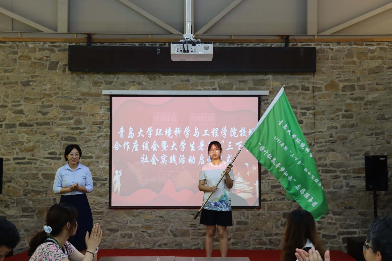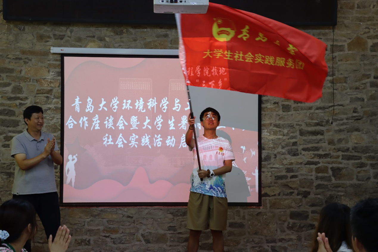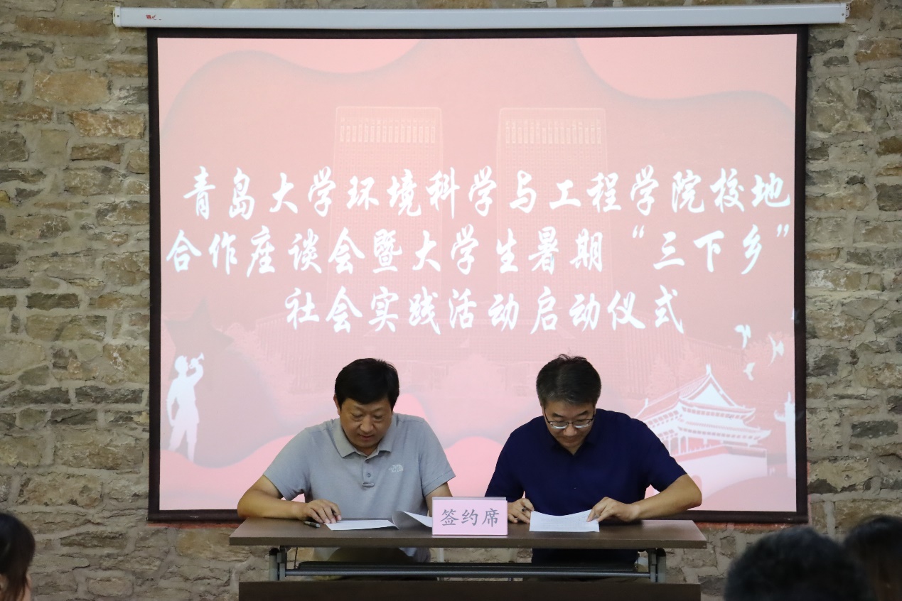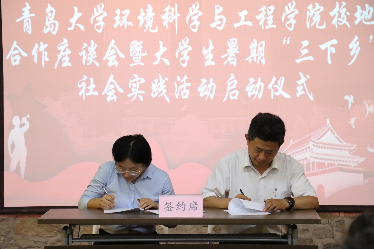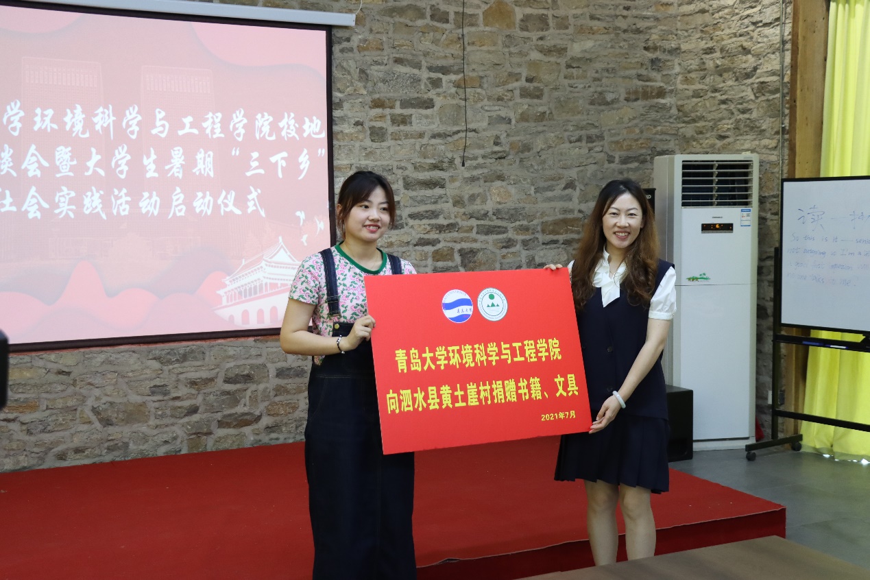 随后,环境科学与工程学院分别与济宁市生态环境局泗水分局、共青团泗水县委分别签订了《大学生实践育人联合培养协议》,双方商定在社会实践、专业实习等方面密切合作,进一步增强实践育人功能,联合培养既有丰厚的理论知识、又有充足的社会实践经验的综合性高素质人才。济宁市生态环境局泗水县分局、泗水县团委还为学院两支暑期“三下乡”社会实践活动团队——“美丽泗水”乡村生态振兴实践团和“绿叶红花,寻梦泗水”志愿服务团授旗。最后,此次泗水社会实践活动团队负责人颜实同学发言,表达了同学们利用这次暑假做好泗水乡村生态振兴与环境保护的决心和信心。刘妍妍代表学院还为泗水县柘沟镇黄土崖村捐赠了书籍、文具等学习物资。