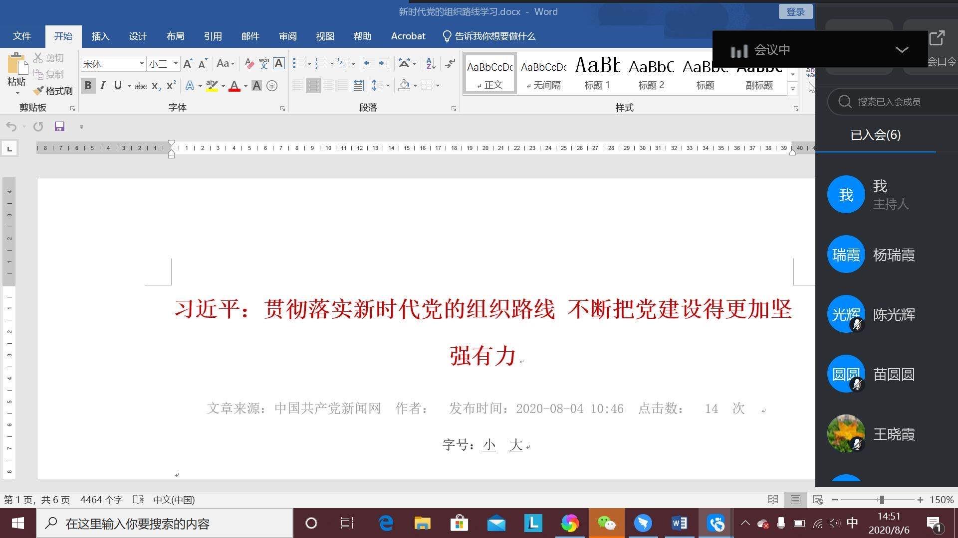 8月6日下午,环境工程教工党支部通过腾讯会议召开集中学习会,支部书记李津主持,全体党员参加。