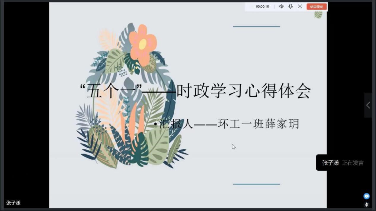 寒假期间,同学们按照放假前的活动安排和要求,积极参与“五个一”素质提升活动。其中“读一本人文社科类的好书”参与17人次,递交读书报告17份;“写一篇学习领会时政的体会文章”参与18人次,递交心得体会文章18份;“写一篇庆祝新中国成立70周年的文章”参与45人次,递交歌颂祖国文章45篇。其余两项同学们仍然克服新冠肺炎疫情带来的冲击和影响,仍然有4篇优秀的民生调研报告和2篇志愿服务记录上交。线上会议中,同学们以PPT的形式向大家分别展示了自己的作品、分享了活动心得,评委团现场打分评出20名同学分别获得一、二、三等奖和优秀奖项,并对获奖同学予以表彰奖励。