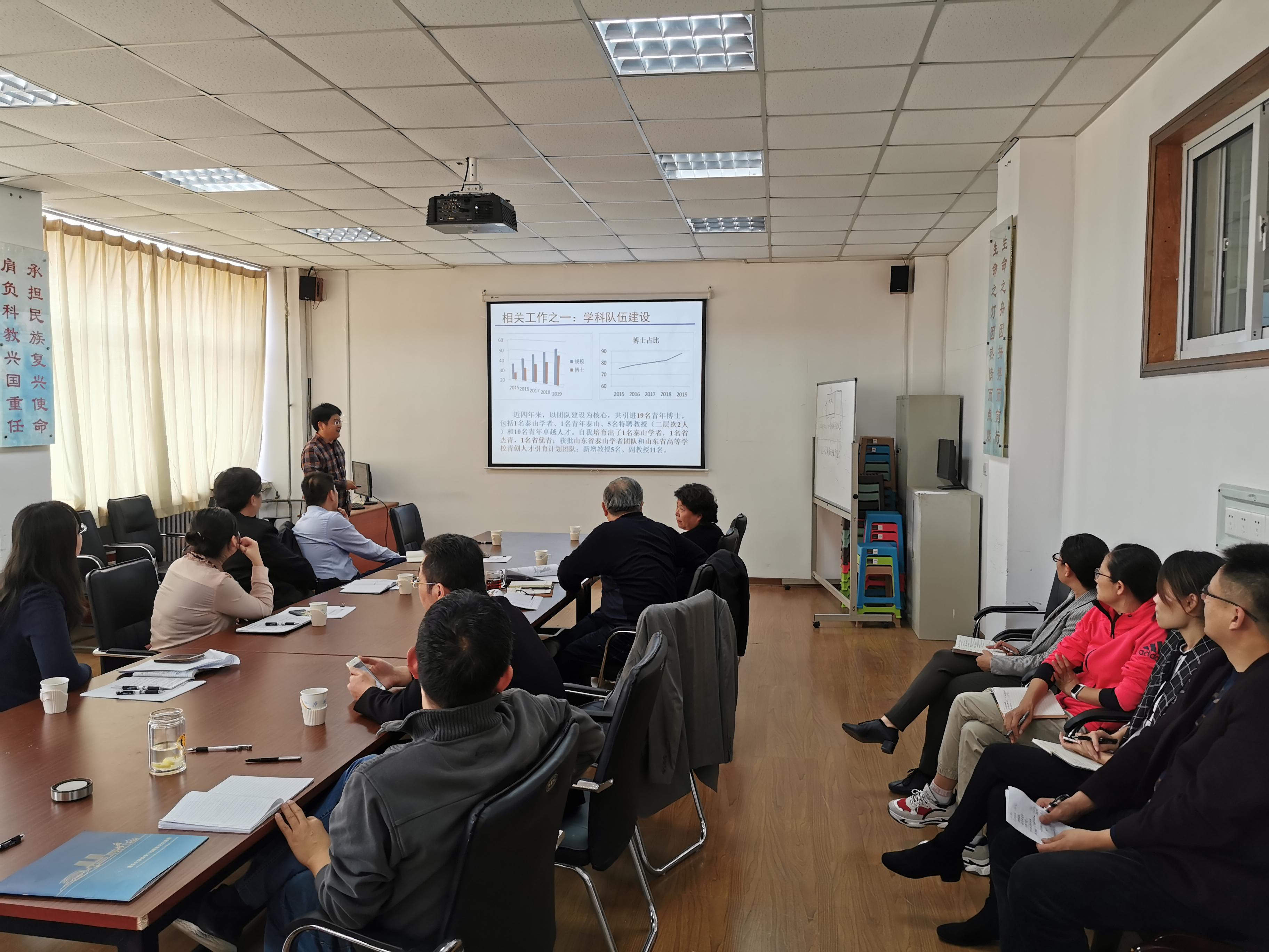 随后,分管学科建设和研究生教育的孔范龙副院长就学院学科建设相关工作及建设成效、博士点申报对标及存在问题、省内外竞争力分析及下步工作思路做了介绍,重点汇报了目前博士点申报存在的问题、下一步工作计划以及希望学校给予的支持等情况。李悦院长结合汇报情况进行了补充说明。汇报完毕后,丛院长一行就汇报内容与学院领导老师进行了深入交流。