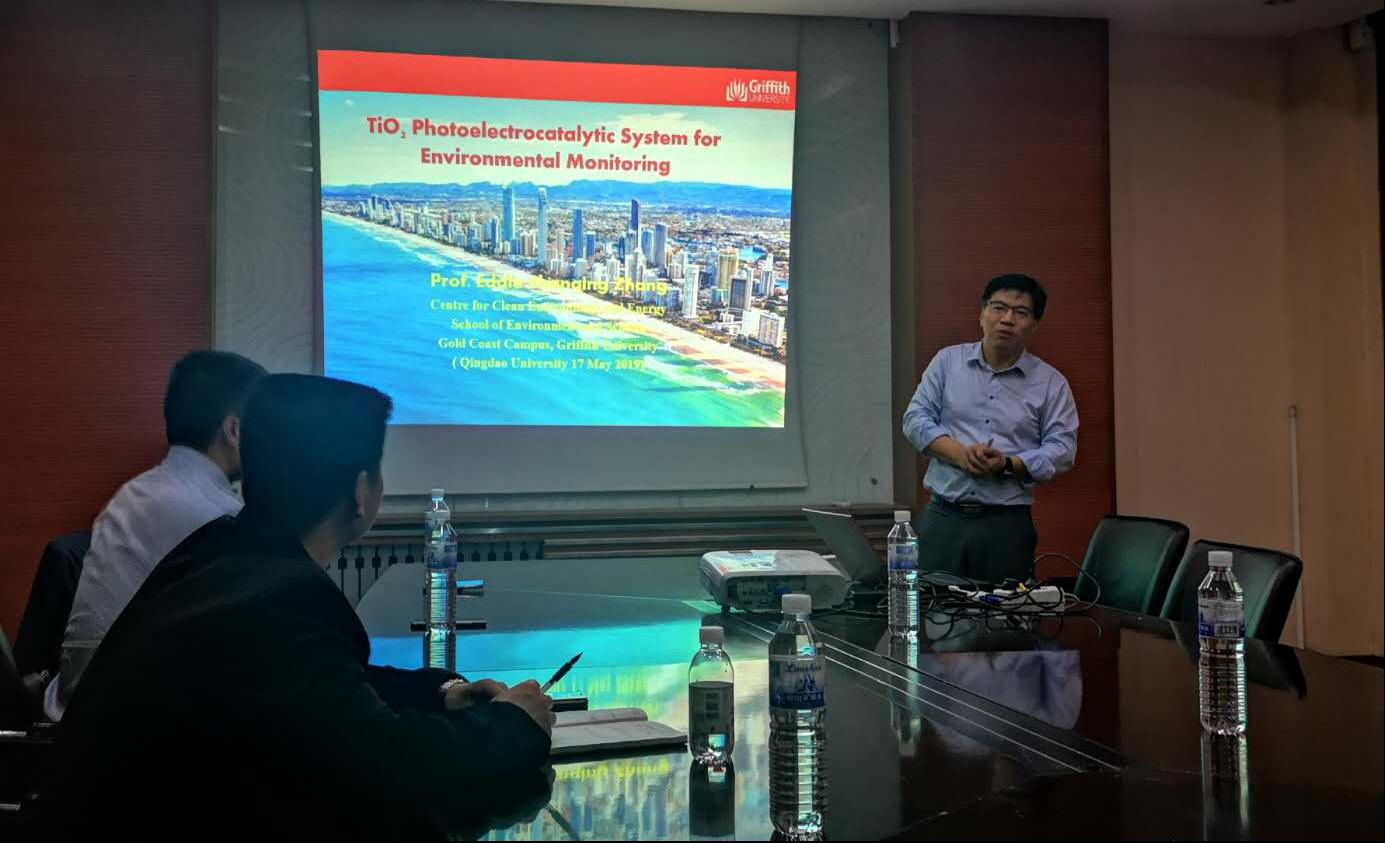 张山青教授以光催化反应机理为导引,向大家介绍了他在PeCOD(光电化学需氧量测定仪)的设计、开发到最后的实际应用方面所做的研究工作。报告结束后,他对现场师生提出的问题一一作了解答和探讨,还向同学们简单介绍了格里菲斯大学的申请和奖学金情况,鼓励并欢迎青大优秀学生加入他们的课题组从事科研工作。