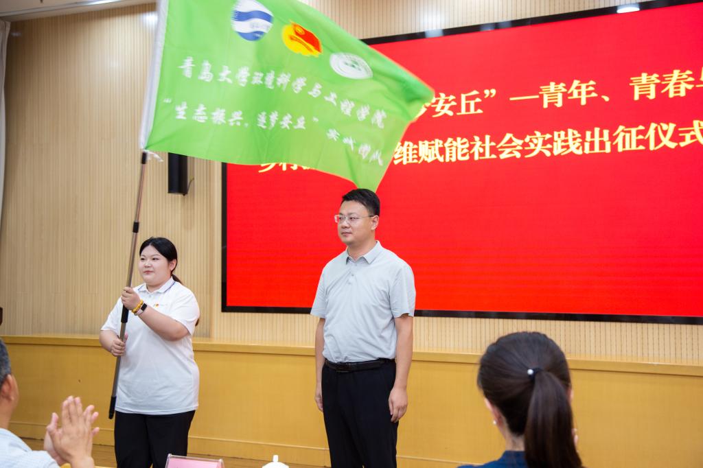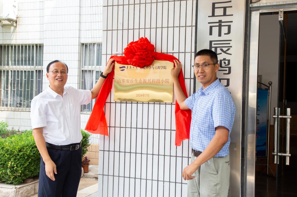 环境科学与工程学院—山东安丘生态振兴科技小院揭牌。共青团安丘市委书记王福强为社会实践团队代表授旗,并希望双方能以此为契机深化共青团组织交流。学院“生态振兴,筑梦安丘”社会实践团队成员朱书曼表示在此次实践活动中,全体成员将遵守纪律,团结协作,不怕吃苦,迎难而上,积极发挥专业优势,为安丘乡村振兴增添青春色彩。