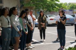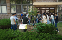 浮山校区东院诚思楼下,环境科学与工程学院举行了2017届毕业生文明离校植树留念活动。学院党委书记沈贵荣、副书记张作祥、学工办主任刘妍妍、团委书记姜志翔和2017届毕业生代表20余人参加了此次活动。