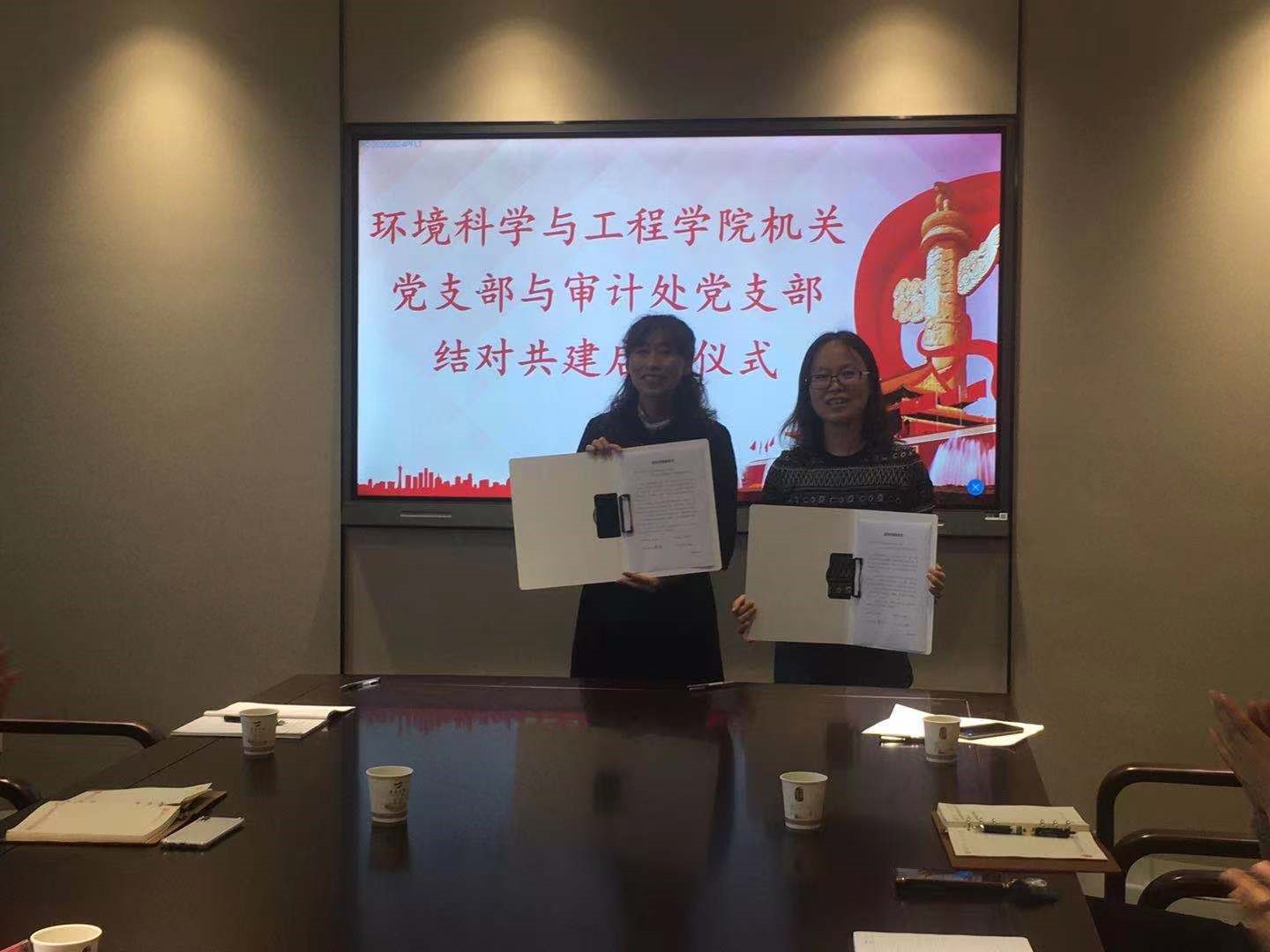 启动仪式上,沈贵荣书记介绍了此次活动的重要意义和学院机关党支部基本情况,就两个支部的共建方案进行了解读。审计处党支部书记赛金英和环境科学与工程学院机关党支部书记张玮共同签署了结对共建协议。赛金英处长认为结对共建是一个促进双方提升的有效途径,表示审计处愿意用专业知识帮助学院建立健全教学管理、科研管理、财务管理、资产管理、采购管理等内部控制体系。