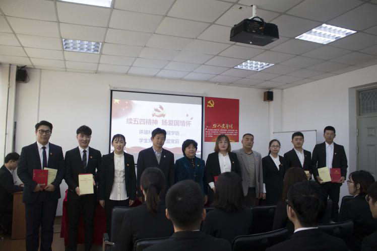 学院党委书记沈贵荣、组织员匡国安、学院党委副书记张作祥和辅导员老师为每一位学生党员佩戴党徽,辅导员王会萃还带领大家举起右手、面对党旗重温了入党誓词。学生党员代表何江龙从纯洁的入党动机开始,讲述了研究生期间如何向党组织靠拢,以及他在学习、工作和生活中所遇到的困难,坚定的理想信念使他克服了重重困难,最终如愿加入党组织的经历。张凤灵从儿时对中国共产党的深刻印象展开,讲述了自己进入大学后努力学习、认真工作,积极向党组织靠拢的经历,分享了作为班长、院学生会主席带领同学们开展了一系列的爱国主义教育活动的经历。老师们为“党员示范宿舍”“入党积极分子示范宿舍”颁发标识牌,并向全体党员赠送了《习近平新时代中国特色社会主义思想三十讲》一书和读书笔记。张作祥从建设学习型党支部和培养社会会主义建设者和接班人的角度,讲解了领会习近平新时代中国特色社会会主义思想的重要辅助读物——《习近平新时代中国特色社会主义思想三十讲》的主要内容,阐述了思想政治学习的重要性,并就如何学好、弄懂习近平新时代中国特色社会会主义思想、真正做到入脑、入心谈了自己的看法,并安排了研读讨论、优秀笔记展示、读书心得分享等系列活动。匡国安为全体学生党员解读了习近平总书记2018年在北大师生座谈会上的讲话精神,强调广大青年要从现在做起,从自己做起,勤学、修德、明辨、笃实,使社会主义核心价值观成为自己的基本遵循,努力在实现中国梦的伟大实践中创造自己的精彩人生。最后,沈贵荣在从知、情、意、行四个方面对本次主题活动的教育意义给与了肯定,她号召全体学生党员继承“五四”传统,坚持爱国、民主、科学和创新精神,按照“五成”目标要求,在学习和实践中锻造自己,努力成为新时代中国特色社会主义建设事业的栋梁之才。
