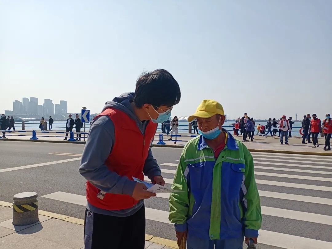 支部成员积极参与,在现场重温五四爱国运动的历史,感悟先辈的革命热情与爱国精神。随后,党支部成员与志愿服务团的成员一道,向游客宣讲《公民生态环境行为规范(试行)》以及垃圾分类等相关知识,努力营造环境保护以及生态文明的良好社会氛围。最后,与环卫工人一道清理垃圾、美化环境,在五一国际劳动节到来之际向环卫工人致以最真诚的敬意,同时,也为岛城的环境卫生尽一份绵薄之力。