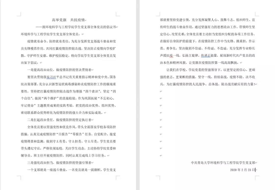 关于进一步发挥全校基层党组织和党员干部作用坚决打赢防控阻击战的通知》精神。学生党员吴至宸代表党支部宣读了《高举党旗,共抗疫情》倡议书,号召全院学生党员要将抗击疫情作为巩固拓展“不忘初心、牢记使命”主题教育成果的实践考验,以更坚定的信心、更顽强的意志、更果断的措施,坚守岗位,勤奋学习,努力工作,为打赢疫情防控的人民战争、总体战、阻击战贡献应有的力量!郝梓然、王琪程、张乃弛三名学生党员分享了各自在当地疫情防控的一线主动承担起志愿服务工作的心得体会。刘妍妍提出六点要求:第一,做好自我防护的同时积极的参加各地的志愿服务工作。第二,配合辅导员老师做好各年级的平安日报、集结号等上报统计工作,做到积极带头,准时不拖沓。第三,严格落实国家学校的各项规定要求,不提前返校。第四,要做文明青大信息督导员,不传谣,不信谣,弘扬主旋律,传递正能量。第五,在家里多学习,通过学习强国等平台多了解国家政策内容。第六,毕业生党员带头以积极的心态面对考研复试和就业,带动起周围的同学,协助老师做好毕业生的各项工作。