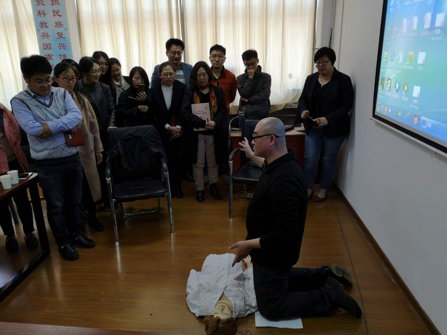 于华医生以《心脏疾病总论》和《高血压症的防治》为题目,深入浅出地讲解了心脏的结构、工作机理和和高血压症的临床表现、诊断和预防,热心解答了老师们提出的问题。胡龙刚医生则做了题为《基础生命支持BLS》的讲座,以PPT的形式现场演示,介绍心肺复苏的流程、注意事项及AED除颤仪的使用方法。最后他现场做了示范演示,还指导老师们做了心肺复苏练习。