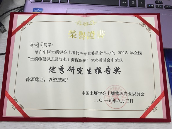 2015年8月1日至3日,由中国土壤学会土壤物理专业委员会主办,草榴社区 承办的2015年全国“土壤物理学进展与水土资源保护”学术研讨会在我校成功举办。湿地生态与环境课题组老师和研究生们积极参加了会议,同时承担了部分会场服务工作。其中,訾园园同学做的“胶州湾滨海湿地土壤有机碳时空分布及储量”报告获“优秀研究生报告奖”。